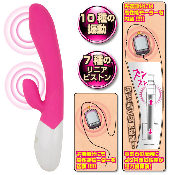 ●さらさら滑らかなシリコンボディ●先端&子機に高性能モーター搭載●電磁石による反発を利用して内部の鉄棒が強力に縦振動●10種振動×7種リニアピストン搭載●お手入れラクラクな生活防水仕様●2時間充電(フル)で1時間使用可能●USB変換ACアダプター付属。