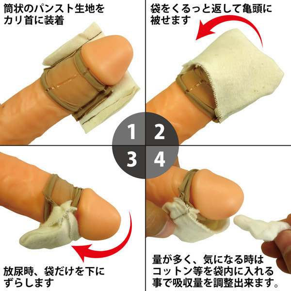 ●ネル生地×ストッキング生地製●亀頭にかぶせるようにして装着●生地をズラすだけでトイレもOK●柔らか生地で締付けの痛みナシ●洗浄することで繰り返し使用可●通気性があるのでムレずに安心●袋部分にコットン等を入れれば吸水量の調節も可能。