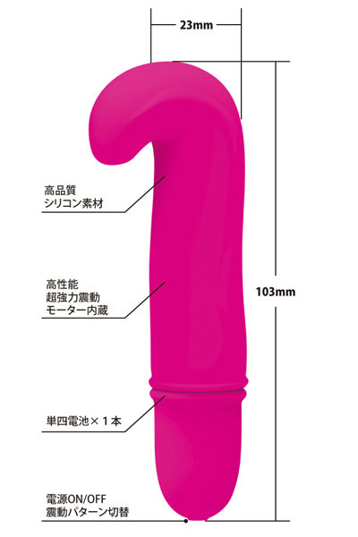 ●全長約10cmほどのハンディサイズ●ほどよい弾力のシリコン製ボディ●肌触りの良いサラサラとした感触●中間部に超強力振動モーター内蔵●飽きのこない10パターン振動搭載。