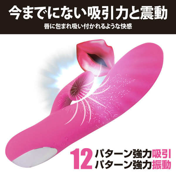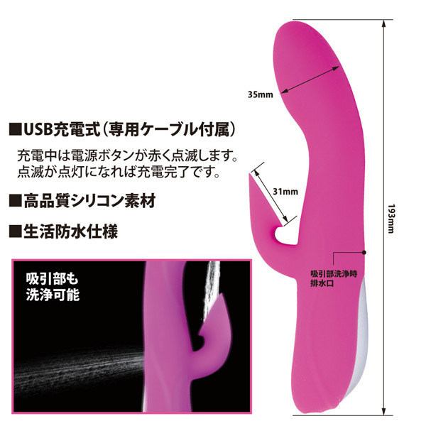 ●肌触り抜群の高品質シリコン●全長19.3cm、最大径は3.5cm●ヘッドに高性能モーター内蔵●角度をつけた先端でG直撃●クリバイブに吸引機能を搭載●唇に吸い付かれるような刺激●強力な12パターン吸引&振動●USB充電式(専用ケーブル付属)●本体は生活防水仕様で衛生的●クリ吸引部分の洗浄も可能。