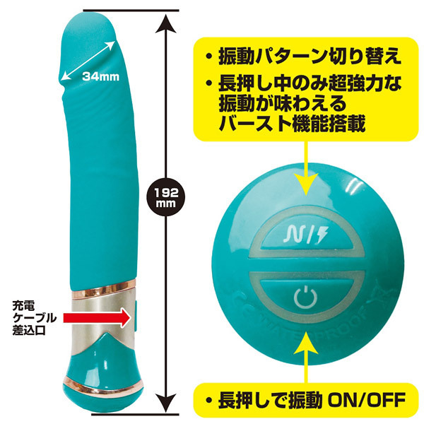 高品質なメディカルグレードシリコン素材を採用したリアルなペニス型のストレートボディには、10パターンの振動+スイング機能に加え、ボタンを押している間だけ超強力に暴れまわるバースト機能を搭載。