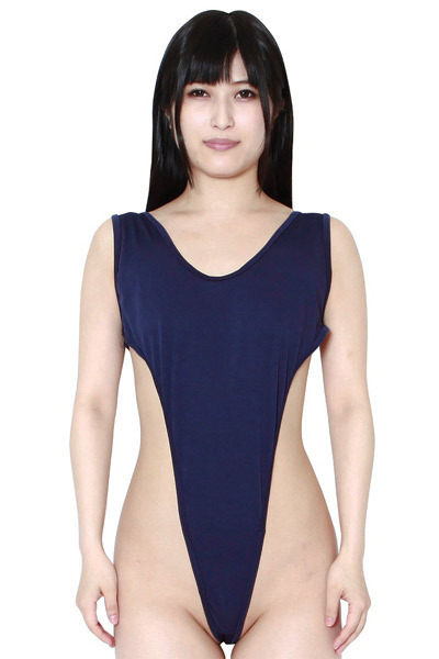 アンダーバストまで切り込みを入れたスーパーハイレグ仕様のスク水で大胆アピール!食い込みが激しいTバックスクール水着。