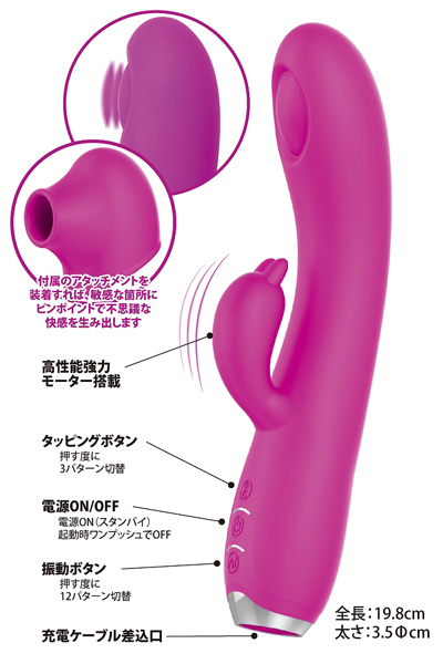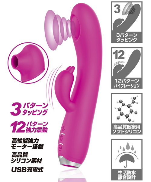 Gスポをトントントン、とリズミカルに叩くタッピング機能と12種類の豊富な振動パターンを搭載!Gスポから伝わる恥骨振動で夢の潮吹き体験も!?素材には肌ざわり滑らかな高品質医療用シリコンを採用、お手入れしやすい生活防水、静音設計。