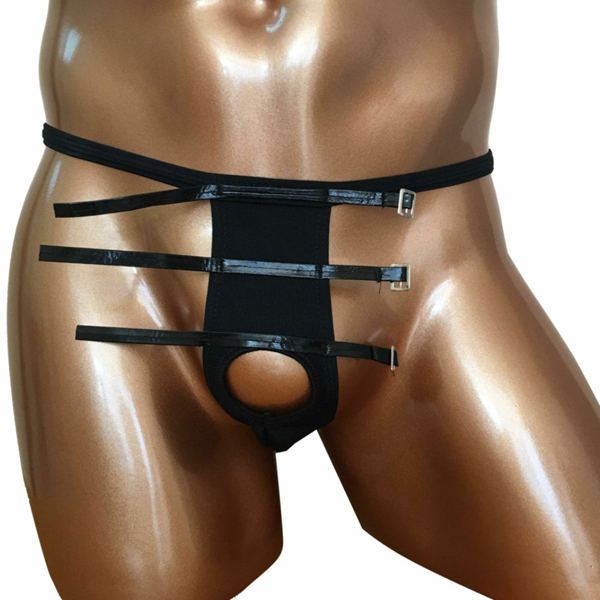 タマ部分を露出する大胆さが魅力の拘束具付きメンズ用Tバック(黒)。