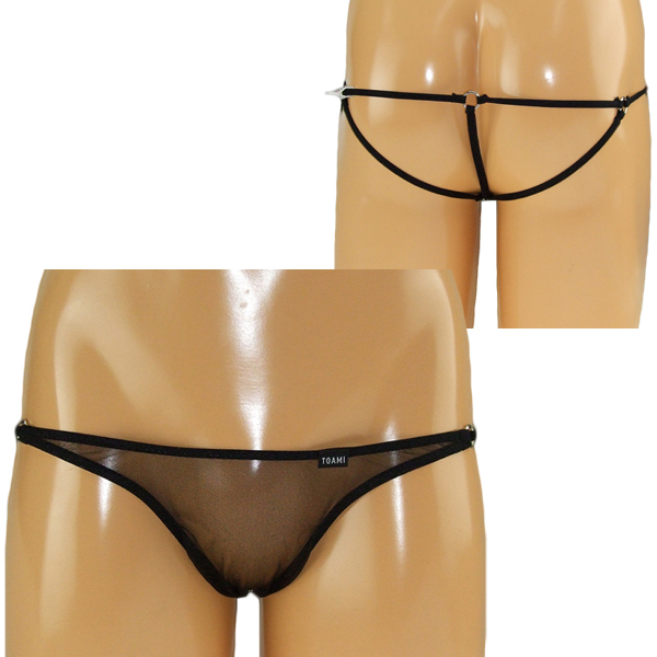 背面は3本紐で仕立てたオープン仕様で、スケスケ生地と紐をメタルリングでジョイントしたお洒落なデザイン!男の色気をたっぷりアピールできるメンズ用オープンショーツです。
