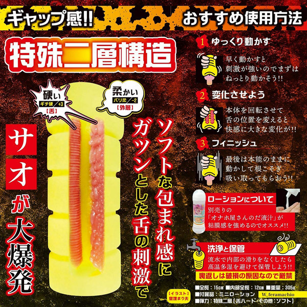 舌だけが固い「特殊二層構造」で大ヒットとなった「フェラ魔チオ」に待望の続編が登場!!ザラついた舌が…這ってゾクゾク ボコついた舌が…絡んでビクビク人では味わえないダブルフェラを楽しめる新感覚オナホール!!でも…気を付けてくださいね?「ダブルフェラ魔チオ」は、舌の感触が特殊な快感のため、オナホ性癖がゆがむ可能性があります