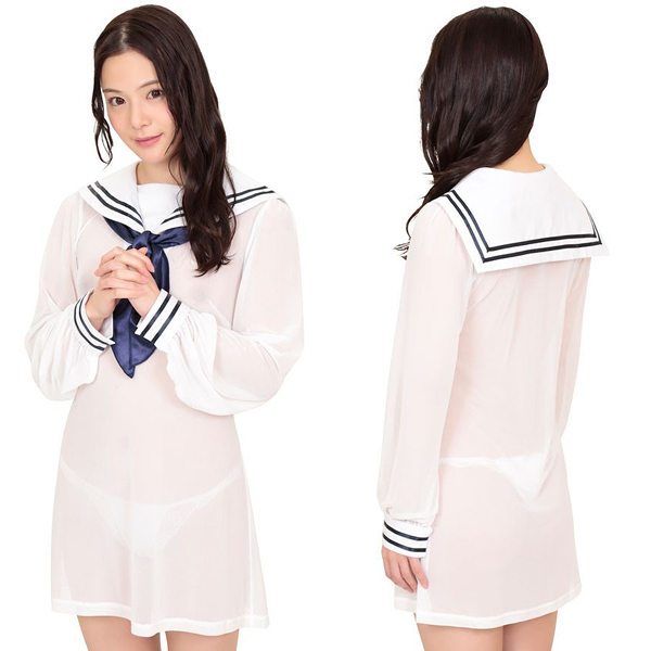 水で濡れたように透け感のある極薄仕様のセーラーワンピ(白)。