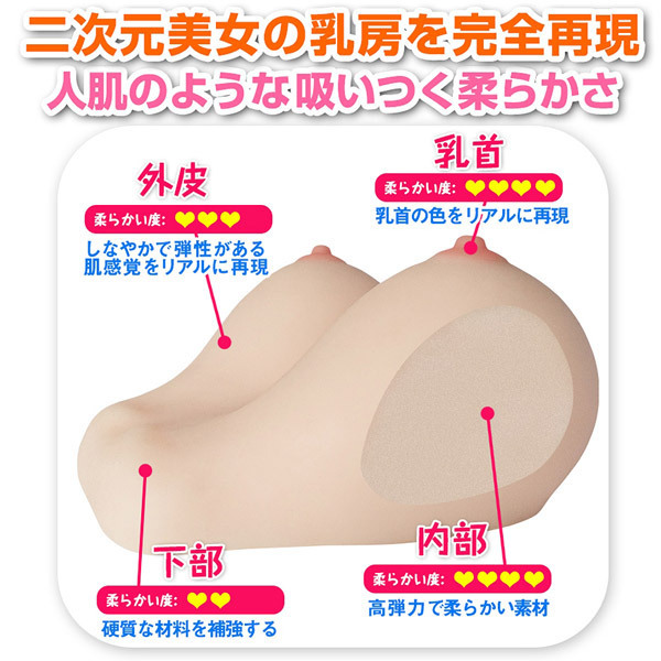 どれだけ引っ張っても変形せず、気になるベトベト感を極限まで軽減した特殊な高弾力素材が人肌を完全再現!ふんわり柔らかな乳房と、非染色ながらほんのりピンクに染まったコリコリとした乳首の感触をしっかり堪能していただけます♪