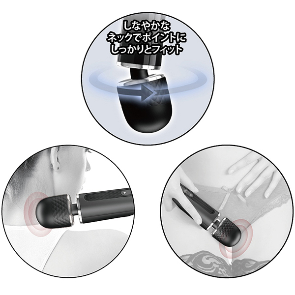 グリップ部分に大きなくぼみがあり凹んでいるので持ちやすい!サイズ的にも女性が一人で持ちやすく当てやすいように考えつくされた親切設計のパワーマッサージャー♪ブラックにシルバーのアクセントが効いたデザインにネックの可動域、低速から高速まで幅広い強弱コントロールができる高性能のデンマです。