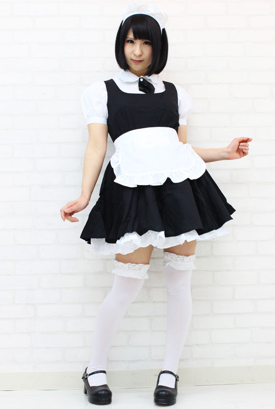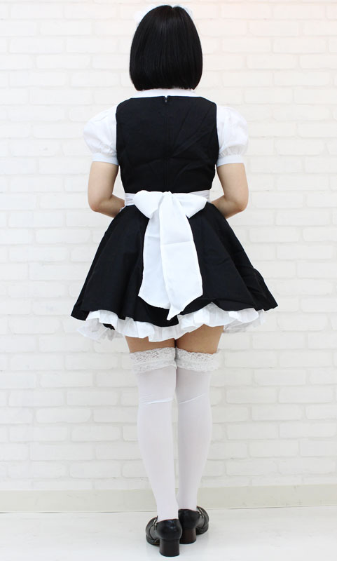Mサイズ:B〜90cmcm・W〜72cm 丈:ワンピース78cm(裾フリル含む)・ブラウス54cm(袖丈21cm、袖幅30cm、肩幅39cm、首周り38cm) セット内容:ブラウス、タイ(ナップボタンにて取り外し可能)、ワンピース(背中ファスナー)、エプロン、カチューシャ