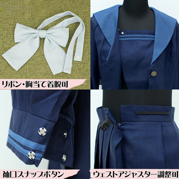 紺無地のセーラーブラウスとプリーツスカートに、ブルーグリーンのリボンがポイントの制服コスプレ。