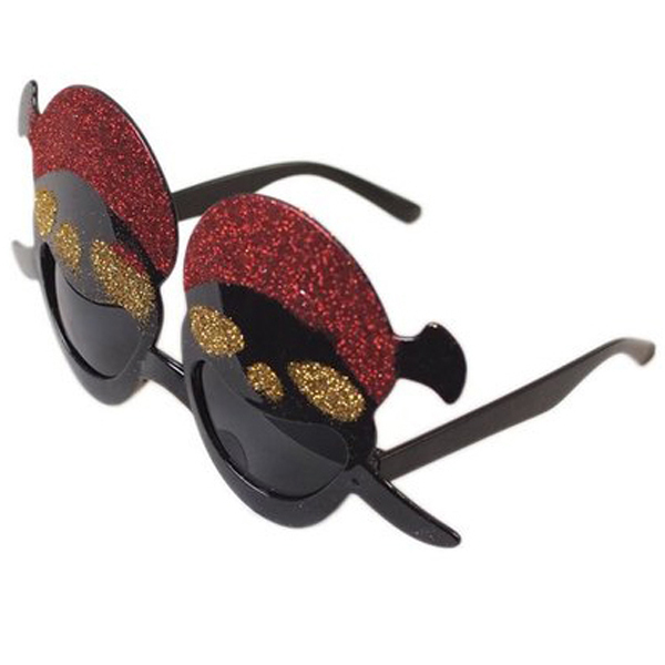 グリッターでキラキラ輝く♪かけるだけで場が華やぐ、ド派手な海賊ドクロ風デザインのサングラス(黒×赤)。