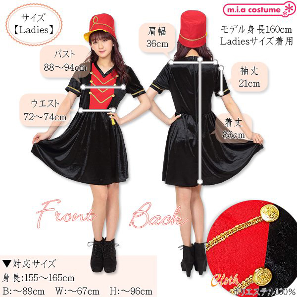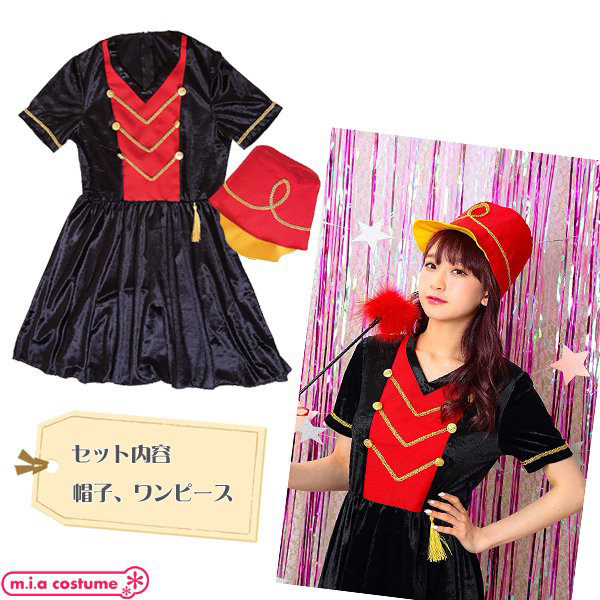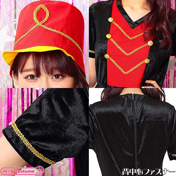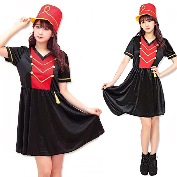 黒ベースのV字ネックワンピに赤を加え、金の装飾を施したクラシックなデザイン!大きく高さのある帽子を被れば貴女も立派なマーチングガールに変身♪背面ファスナー式で裏地はありません◎Fサイズ