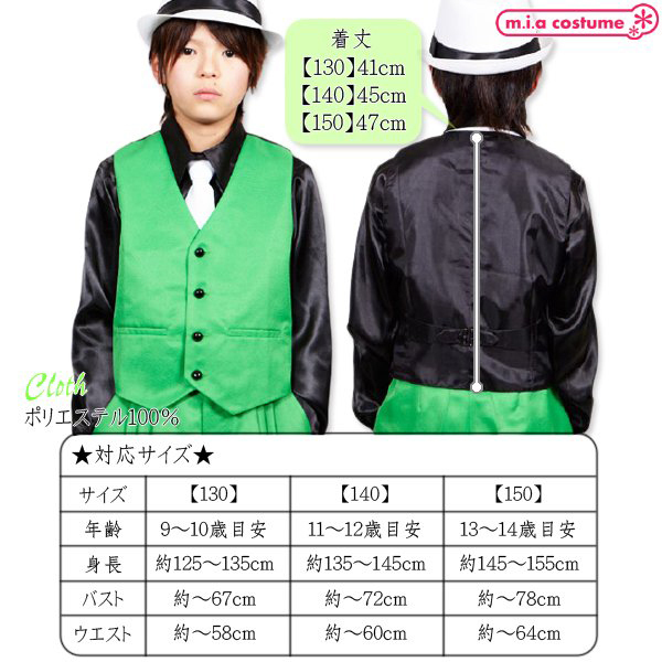 140サイズ 対応サイズ:身長135〜145cm・B〜72cm・W〜60cm 実寸:着丈45cm セット内容:ベスト単品(前ボタン) 素材:ポリエステル100%