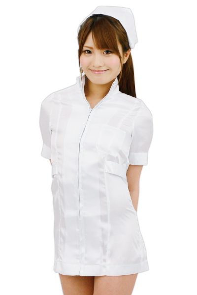 タイトな半袖ワンピースは、フロントのファスナーで胸元の露出度を調節可能!もちろんナースキャップもセットです。