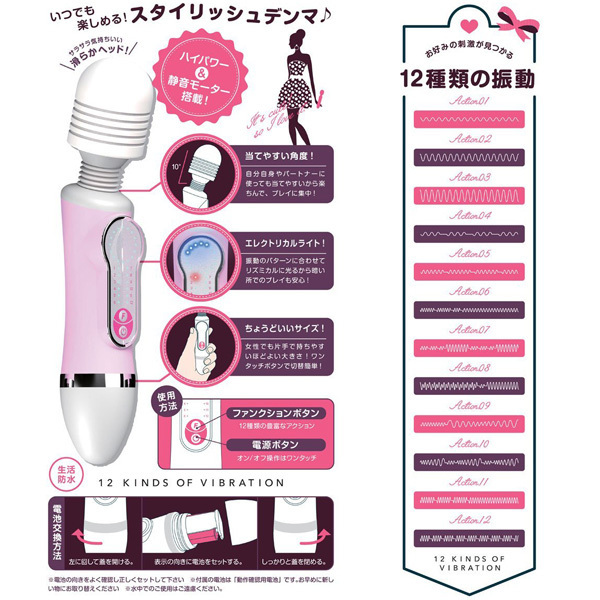 ●お肌に優しい滑らか素材ヘッド●当てやすい10度の角度付き●モーター最大回転14000rpm●12種類の振動アクション搭載●ワンボタンの簡単操作●振動パターンと連動するライト●静音&生活防水仕様。