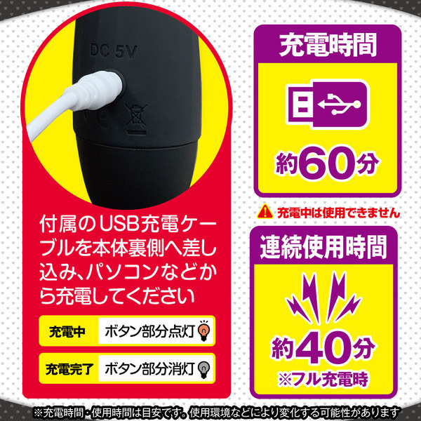 パッケージ:23.4×7.4×5.5cm 本体:全長17.5cm・ヘッド高さ4.0cm・ヘッド幅3.7cm セット内容:本体、充電ケーブル USB充電式