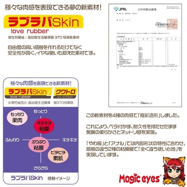 ●ヴァギナとアナルの二穴タイプ●クワトロ=4種類もの素材を使用●外側:弾ける素肌を再現したハリ感●内側:柔らかすぎる?モッチリ肉感●膣側:プリプリやわやわな粘膜層●アナル側:キツ系ねっちり粘膜層●ヴァギナ(非貫通)→膜付き・うねる膣道・ぷっくりヒダ●アナル(貫通)→ジョリッと溝ヒダ・ストレート構造。