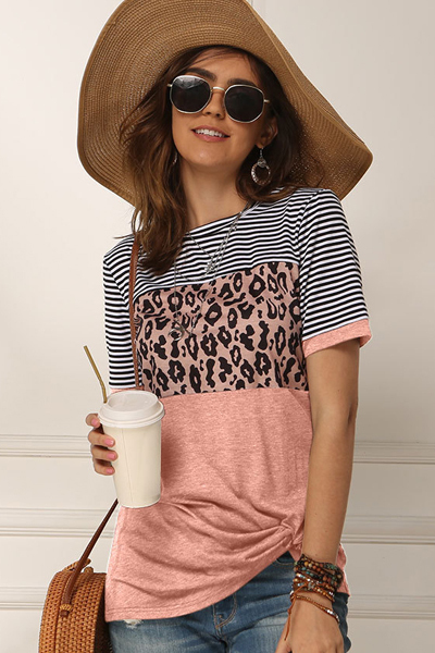 ボーダー×ヒョウ×無地を組み合わせた個性派切り替え半袖Tシャツ。