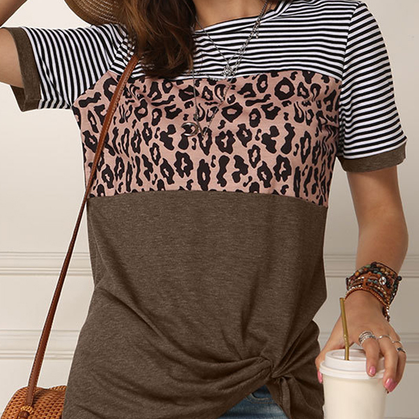 胸元でヒョウ柄に切り替えたブラウンカラーの半袖Tシャツ。