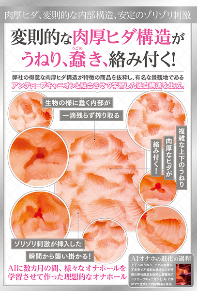タマトイズAI、国内自社工場製、日本製、AIに数カ月の間、様々なオナホールを学習させて作った理想的なオナホール、複雑な内部構造がうねり、蠢き、絡みつく!弾力のあるフレキシブルスキン使用、高弾力・高伸縮素材、匂い控えめ。