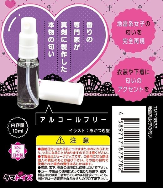 地雷系女子特有のあの匂いを完全再現した匂いフェチグッズが登場♪甘すぎないのに個性的で危うさ漂う、魅惑の香りを忠実に再現!香りの専門家が本気で製作した本物志向のアイテムです♪シュッと手軽に使えるアトマイザータイプで、抱き枕やラブドール、オナホールにふりかければリアル感がさらにアップ!衣装や下着に吹きかけて、匂いのアクセントにもおすすめです♪地雷系女子のそばにいるような新感覚の香り体験をぜひお楽しみください!内容量は使いやすい10mlサイズで、アルコールフリーなのも安心♪あの時感じた、忘れられないあの匂いをもう一度お楽しみください!●TMT-1822