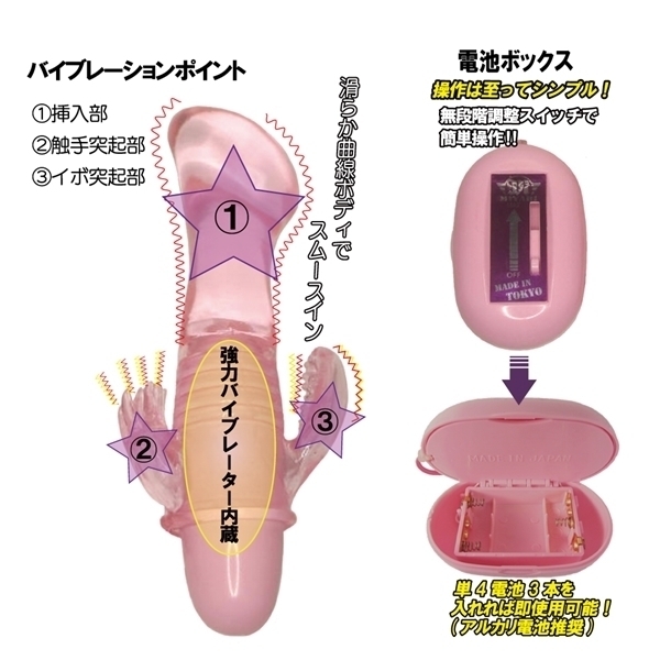 3つのポイントを集中的に刺激する快感増幅バイブ!ヘッドの形状は滑らかな曲線で楽々スムースイン、敏感G●ポットを大胆刺激!下部にあるイボ突起は柔らかく、伝わるバイブレーションでク●への刺激に歓喜!!反対側にある触手突起はまるでブラシの様。